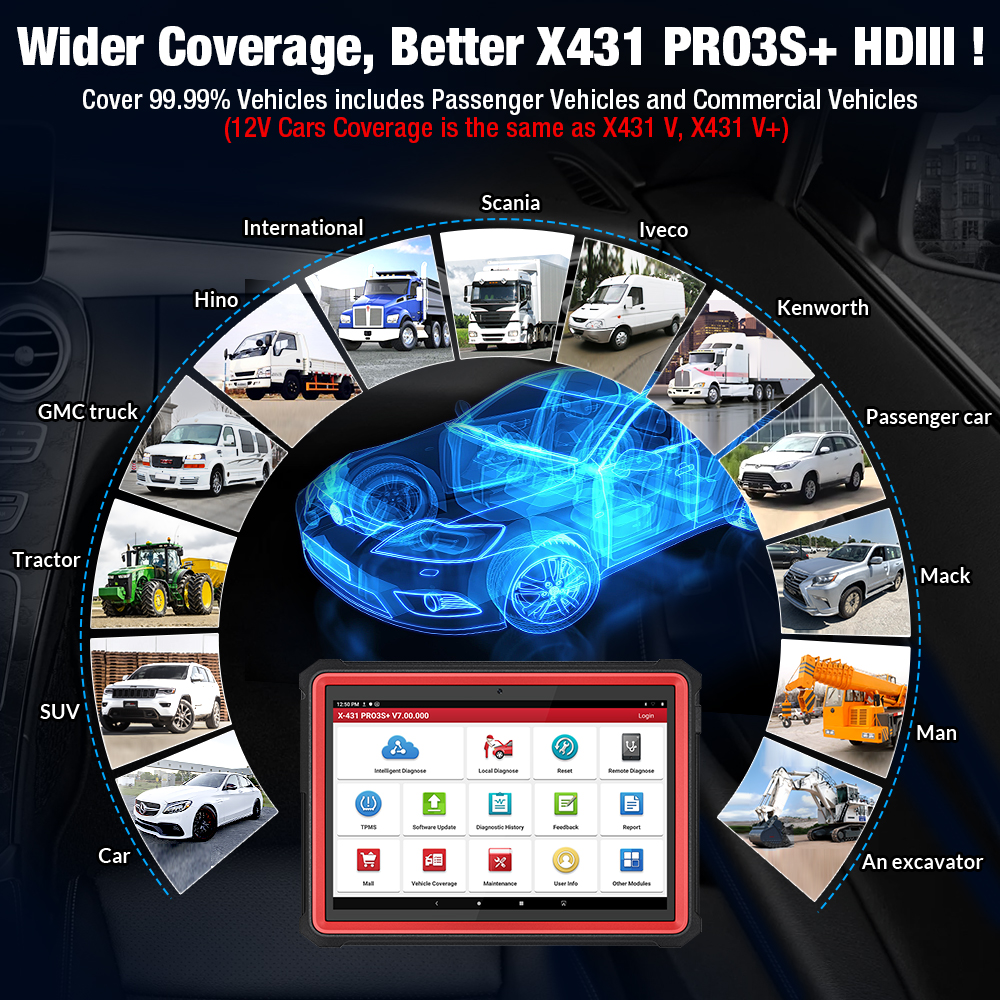 There are many other full-system diagnostic scanners on the market, but most of them only support 50-60 cars, and can only be used as cars or only trucks. Our launch X431 pro3s+ HDIII supports both car and truck integration , Over 164 diagnostic software , 10,000+ models, and are constantly being updated, including 12V & 24V cars, trucks, buses,Machinery.....can Read DTCs, Clear DTCs, Read ,Data Stream, for all system, including ,engines/Auto Transmission /Airbags/Immobilizer/Key Coding/ABS/Cruise Control/Instruments/ Self Leveling Suspension systems /Seats /Doors /Gateway/Steering etc.